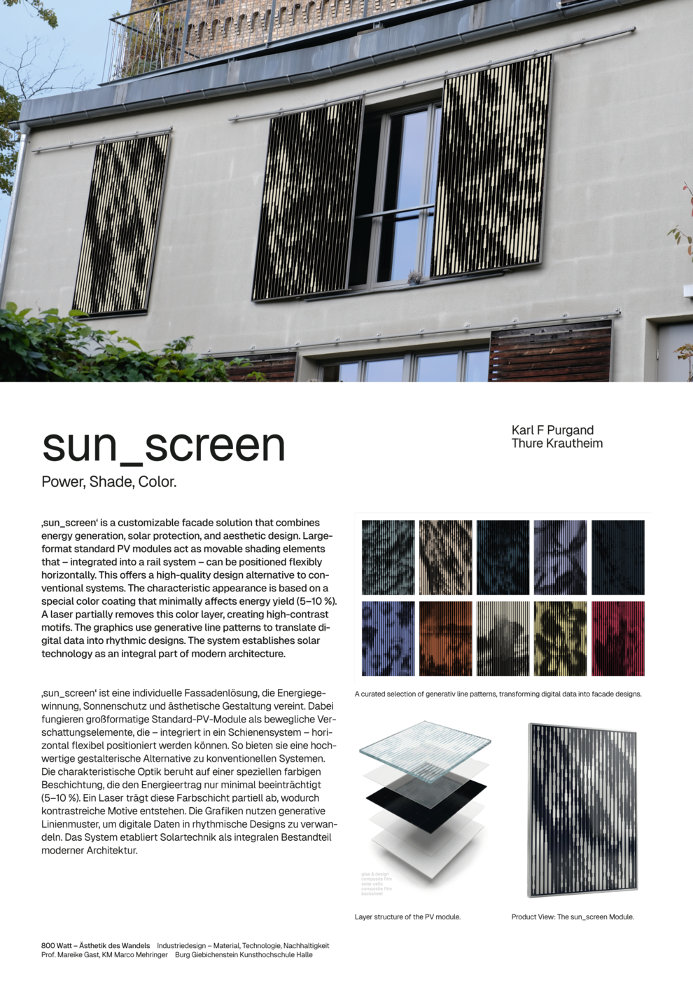 sun_screen ist eine individuelle Fassadenlösung, die nachhaltige Energieerzeugung, effektiven Sonnenschutz und ästhetisches Design für städtische Umgebungen kombiniert. Die Konzeptidee ist bei einem Spaziergang in Halle entstanden, als ungenutzte „Solarlücken” im Stadtbild identifiziert wurden. Während aktuelle Plug-in-Solargeräte oft nicht harmonisch in die Architektur passen, löst sun_screen dieses Problem, indem es Standard-PV-Module in dynamische, hochwertige Beschattungselemente verwandelt. Durch die Integration großformatiger Module in ein Schienensystem können Benutzer die Paneele horizontal über die Fassade bewegen. So entsteht ein funktionales Fassadenelement für mehr Privatsphäre und ein visuelles Statement.