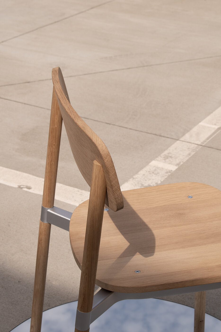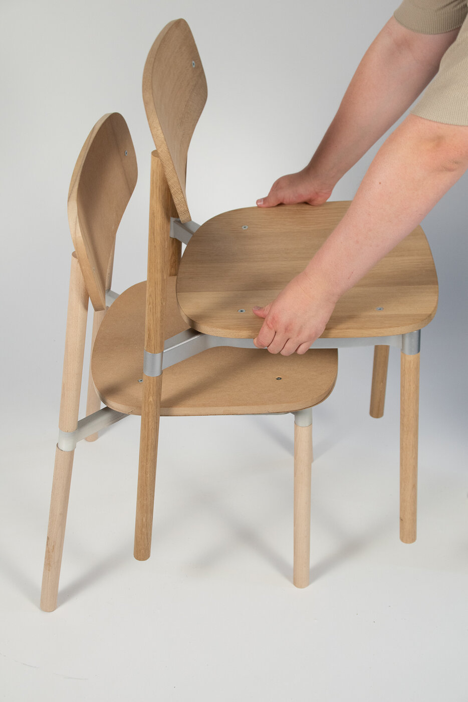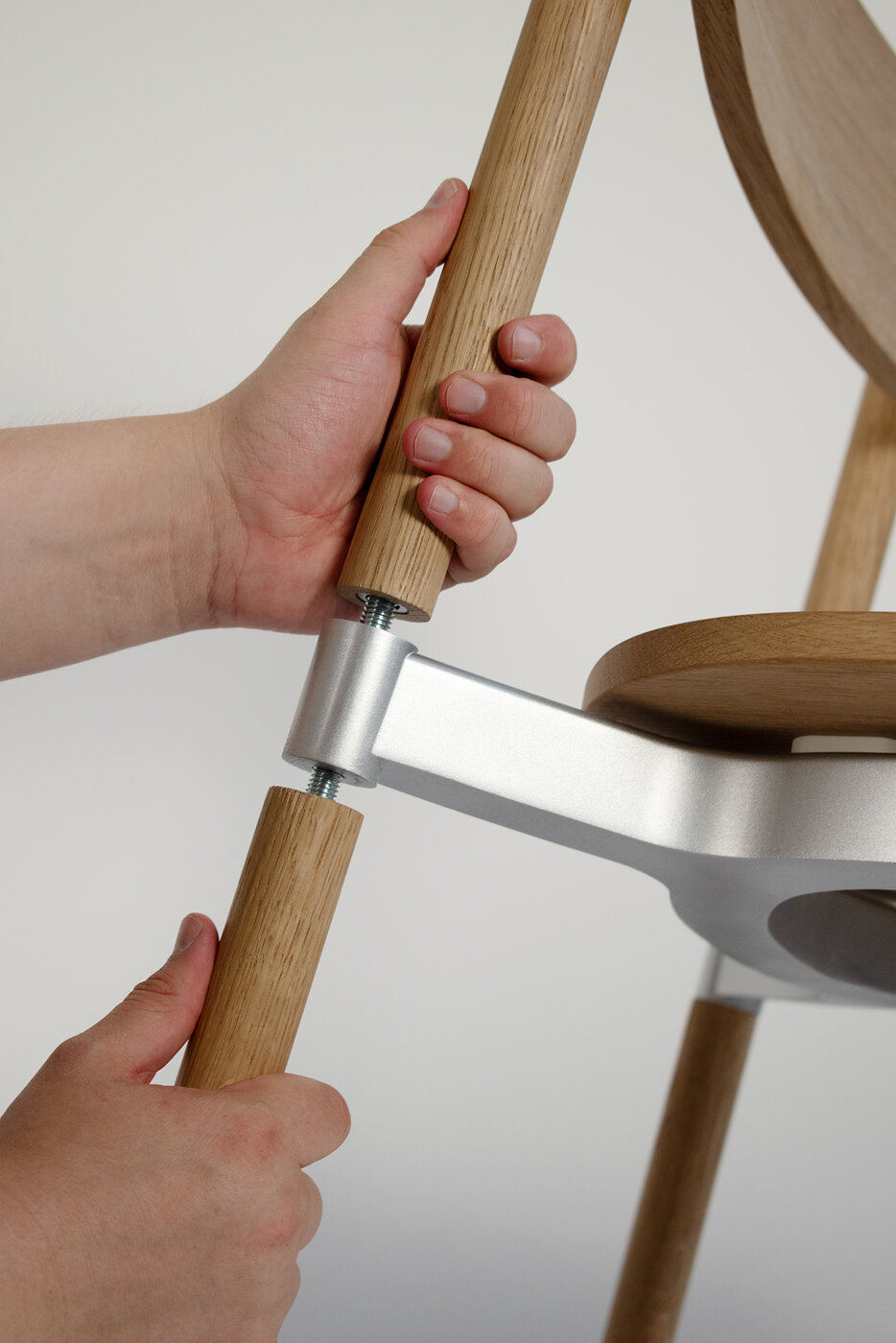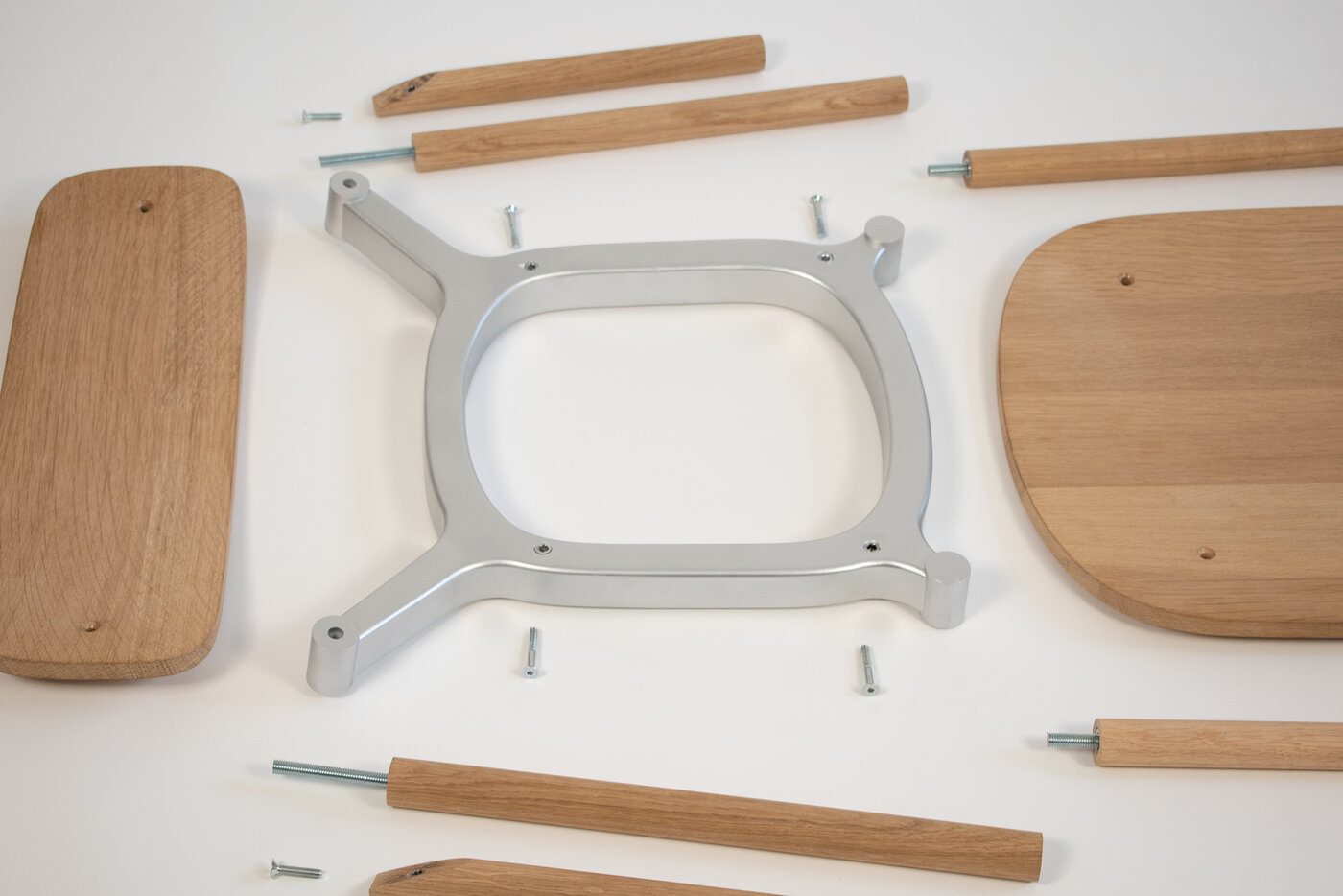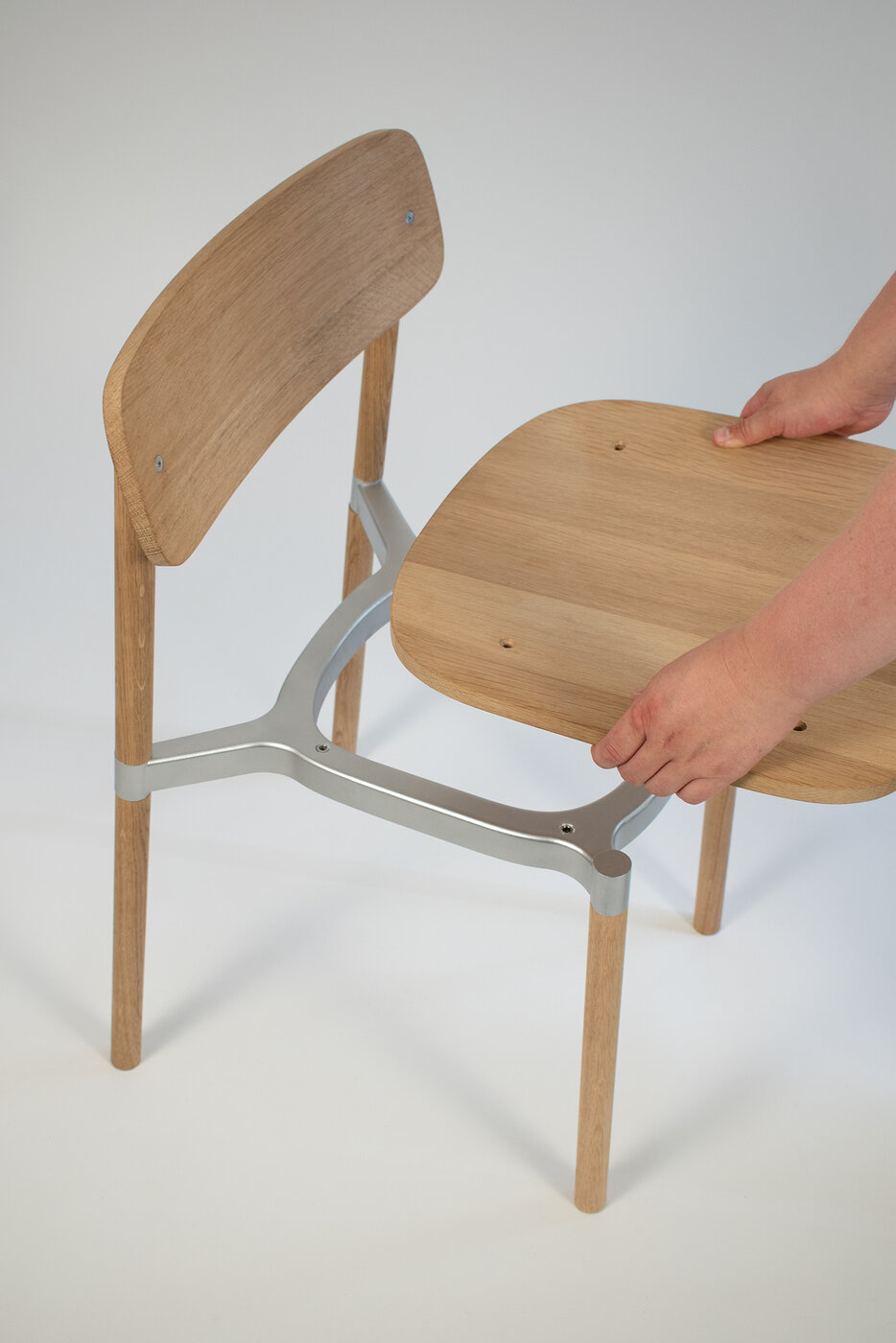 Die Verwendung sortenreiner, trennbarer Materialien ermöglichen eine leichtere Rückführung der Möbel am Ende ihrer Nutzungsdauer. Ein Aludruckgussteil dient als langlebiger Verbinder und kann verschiedene Gestelle und Korpora aufnehmen. Dies erhöht gleichzeitig auch die Variantenvielfalt für den Gastronom, der aus einer Vielzahl an Material- und Formkombinationen auswählen kann.