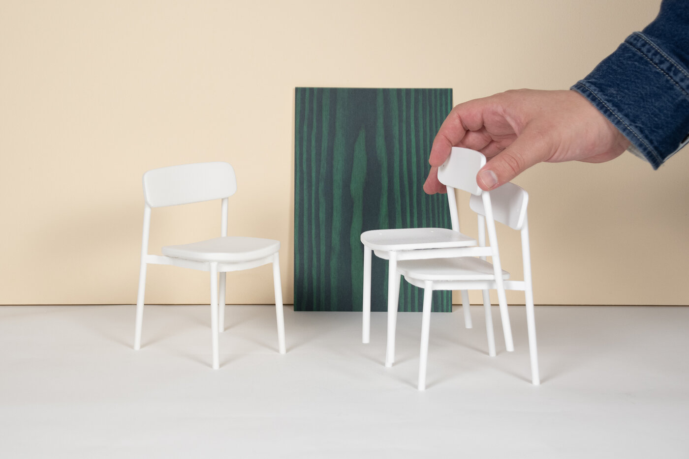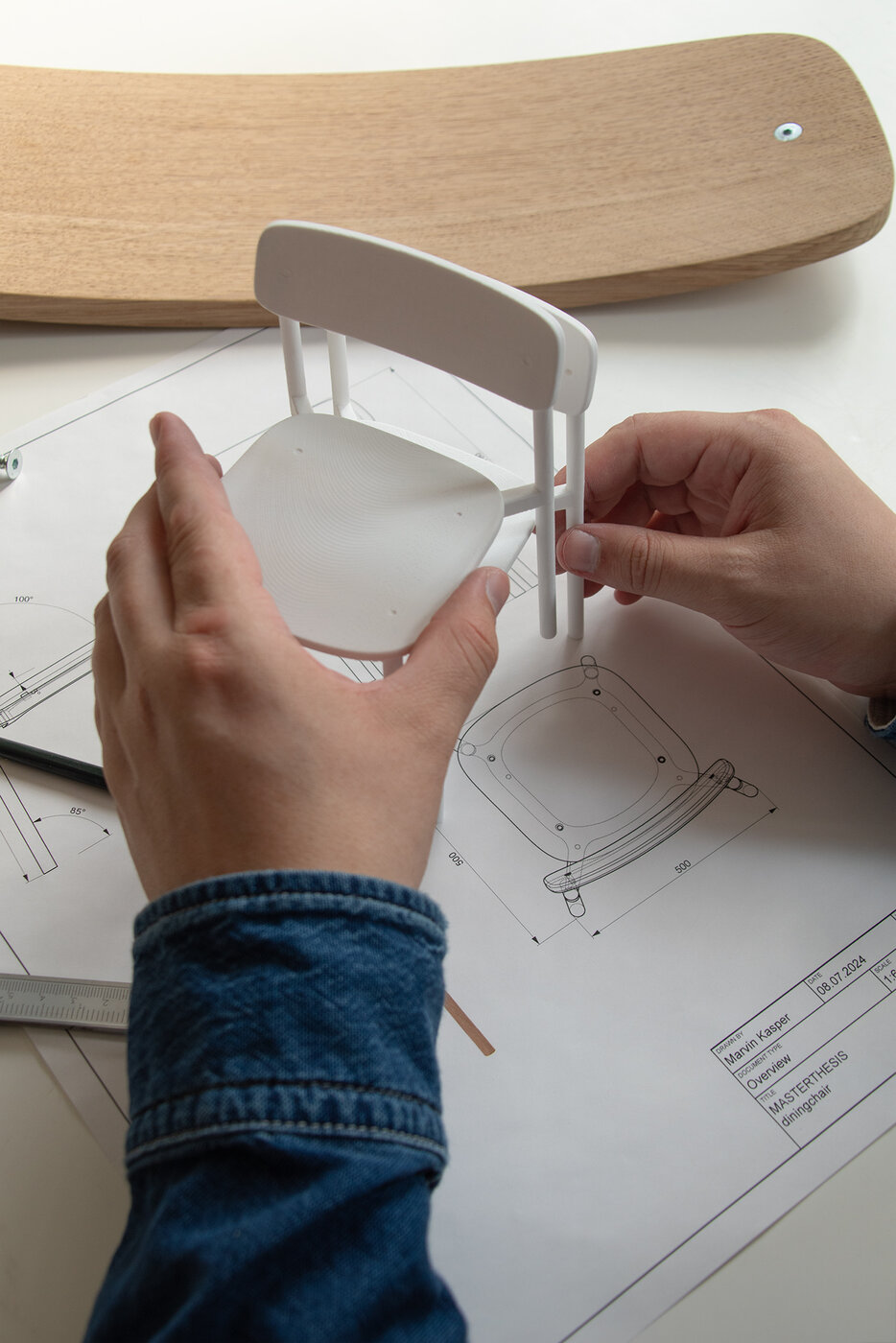 Take a Seat beschäftigt sich mit ebendieser Fragestellung. Nach den Prinzipien der Kreislaufwirtschaft entstand ein System, welches modular, reparierbar und recyclingfähig ist. Ein wesentlicher Teil war die Auswahl und Kombination verschiedener Materialien mit Nachhaltigkeitsstrategien (Reuse, Repair, Recycle): Massivholz wurde gewählt, da es durch Abschleifen und neues Ölen eine lange Lebensdauer erhält. Polstermöbel wurden so gestaltet, dass sie durch austauschbare Bezüge und TPE-Schäume flexibel und recycelbar sind. Formvlies eignet sich hervorragend zum Recycling. Polypropylen-Rezyklat kann thermoplastisch verformt werden, und Pulpe ist aufgrund ihrer kurzen Lebensdauer und einfachen Recyclingfähigkeit ideal für kurzlebigere Möbel.