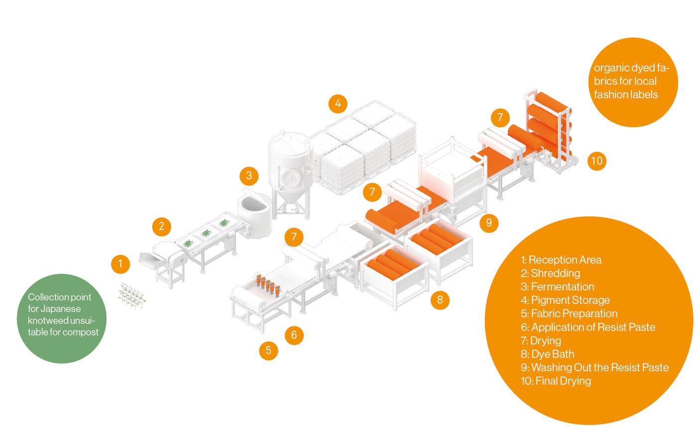 TFP untersucht, wie aus einer invasiven Pflanze ein wertvoller Rohstoff für nachhaltiges Textildesign entstehen kann. Im Zentrum steht der Japanische Knöterich, eine Art, die sich aggressiv ausbreitet und sowohl Ökosysteme als auch Infrastruktur schädigt. Anstatt als reines Problem betrachtet zu werden, dient er in diesem Kontext als Quelle für natürliche Pigmente. Durch einen gezielten Fermentationsprozess werden Farbstoffe aus Stängeln, Blättern und Wurzeln gelöst. Diese biologische Methode intensiviert und stabilisiert die Farben, verbessert die Haptik der Stoffe und verzichtet vollständig auf synthetische Chemikalien. Das Ergebnis sind biologisch abbaubare, leuchtende Textilien, die ökologische Verantwortung mit gestalterischem Anspruch verbinden. Parallel dazu kommt ein digital gesteuertes Stempelwerkzeug zum Einsatz, inspiriert vom traditionellen Blaudruck. Mit auswechselbaren Stempeln und CNC-Technologie wird Reservierungspaste in präzisen, wiederholbaren Mustern auf den Stoff aufgetragen. Dadurch lassen sich komplexe, digital entworfene Motive mit der sinnlichen Qualität handwerklicher Druckverfahren kombinieren. Die Verbindung von pflanzenbasierter Fermentation und digitaler Musterherstellung eröffnet kleinen Labels und Designer:innen den Zugang zu einzigartigen, ökologisch gefärbten Stoffen und verdeutlicht zugleich, wie Gestaltung aktiv zu einer Kreislaufwirtschaft beitragen kann.