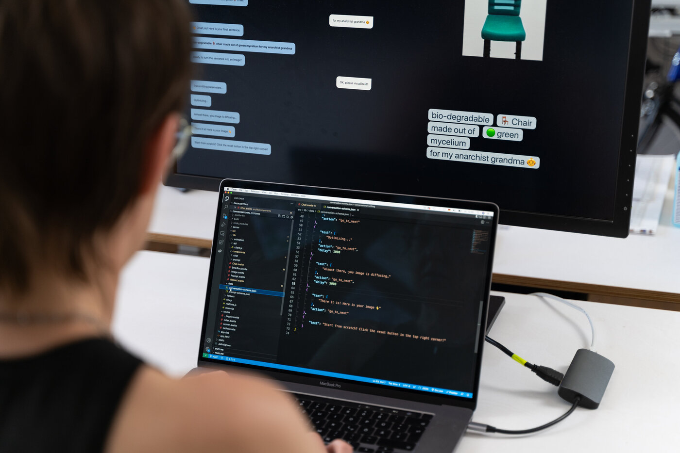 Über einen Chat steht Verboscope mit den Nutzer*innen im Dialog. Aus den Bildanweisungen im Chat erstellt das System Bildwelten die durch weitere Eingaben iterativ beeinflusst und geformt werden können. Mit fortschreitender Nutzung wächst ein Korpus von Bildern aus Situationen, Orten und Objekten, die so zuvor noch nicht existierten.