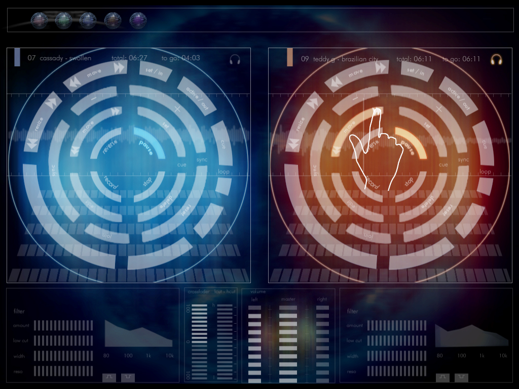 Im Zentrum des Entwurfs stehen die beiden runden Hauptsteuerungsebenen. Diese sind bewusst in Assoziation zum wichtigsten Gerät der Anfänge der DJ-Szene dem Plattenteller gestaltet. Nach funktionalen Aspekten sind die entscheidenden Werkzeuge zu einer Kreisform zusammengefasst. Anordnung und Funktionalität unterstützen die Dynamik der Handlung, da sie im unmittelbaren Aktionsbereich des Akteurs liegen. Durch die strikte Beschränkung auf einfache klare grafische Grundelemente gelingt es trotz Transparenz eine eindeutige Arbeitsebene für den DJ zu schaffen. Gleichzeitig kann der DJ von der Musik beeinflusste grafische Strukturen ein- und ausblenden, Tools wegschalten oder deren Größe und Lage verändern.