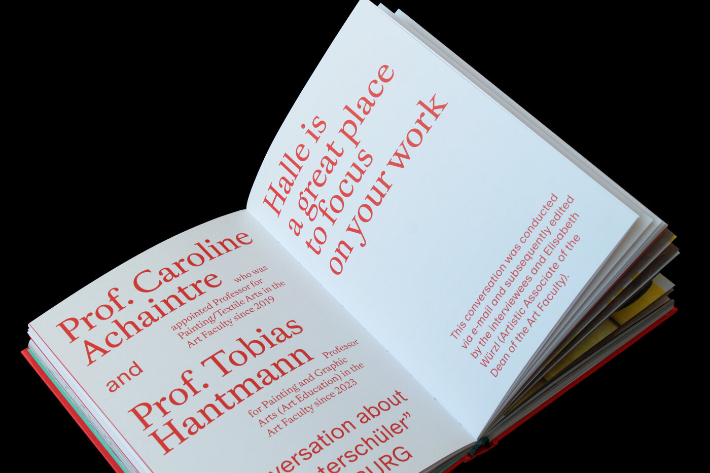 The publication first guides the reader through the installation of the exhibition and gives an impression of the scope of the individual works and how they were presented in the gallery spaces. This is followed by a transcribed conversation between Caroline Achaintre (Professor for Painting/Textile Arts) and Tobias Hantmann (Professor for Painting and Printing Practice) on the ‘Meisterschüler*innen’ programme at BURG.