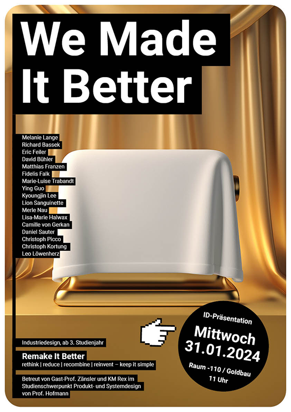 In diesem Semesterprojekt setzten sich die Studierenden mit bereits existierenden Produkten auf dem Markt auseinander. Dazu betrachteten sie eine Auswahl an Produkten genauer, sezierten und dokumentierten diese und ordneten sie in bestimmte Systeme sowie Nutzungskontexte ein. Dabei wurde versucht, mögliche Potenziale zur Verbesserung zu identifizieren, Vereinfachungsstrategien zu entwickeln