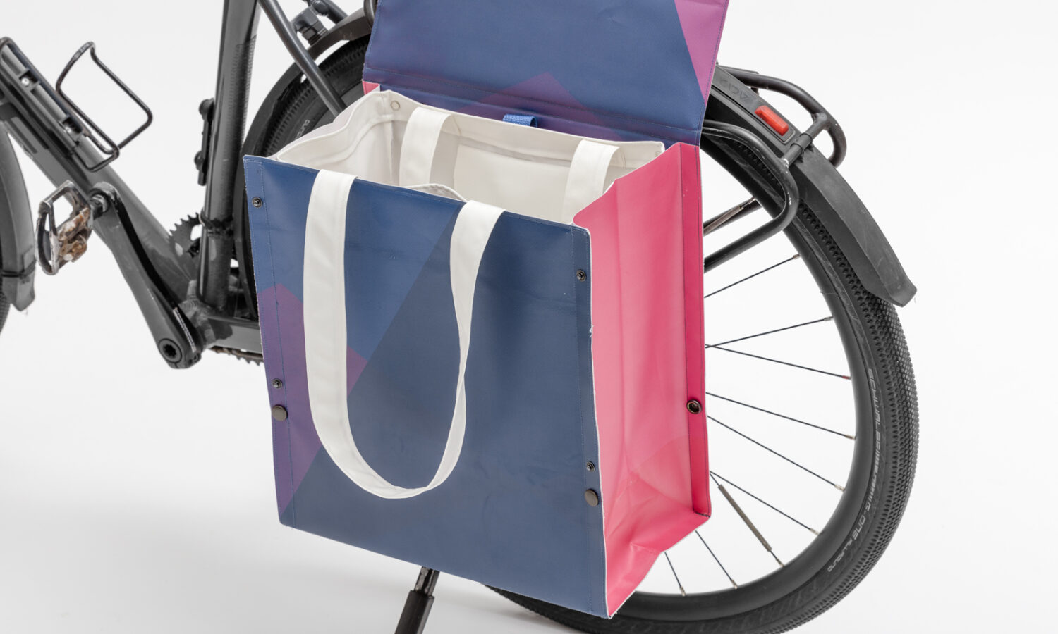 Diese Gepäckträgertasche ist dafür bestimmt, dauerhaft am Fahrrad angeschlossen zu sein. Die spezielle Falttechnik ermöglicht eine ON/OFF Funktion. Im ON Zustand ist sie wasserdicht, stabil und verfügt über 19 Liter Stauraum. Auf nur noch 2 cm zusammengefaltet ist sie im OFF Zustand kaum auftragend, und verändert somit nicht die Dimensionen des Fahrrads. Die klassische Funktion einer Fahrradtasche wird durch eine individuell gestalt- und herausnehmbare, sowie dimensionsgleiche Innentasche angeboten. Verbessert wird diese jedoch durch vorhandene Innenaufteilungen.